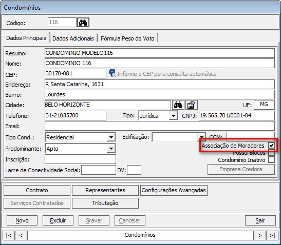 Quando, no Cadastro do Condomínio, a opção “Associação dos Moradores” estiver marcada: