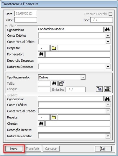 Nessa tela será possível realizar transferências bancárias entre condomínios. Os valores podem ser transferidos entre contas reais ou virtuais, de forma a realizar débito na conta de um condomínio e creditar na conta de outro. Para que essa tela seja exibida, é preciso selecionar a opção Trabalhar com Conta Pool na tela Configuração do Sistema aba Conta Pool.