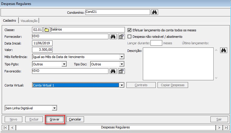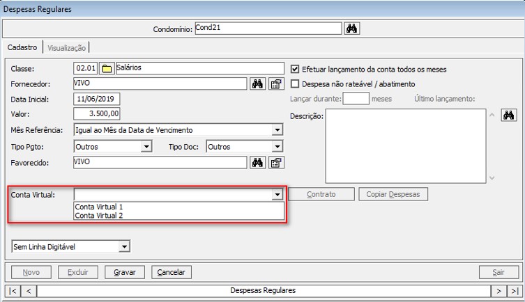 Clique no botão Novo para inserir uma nova despesa regular, selecione a conta virtual na opção Conta Virtual.