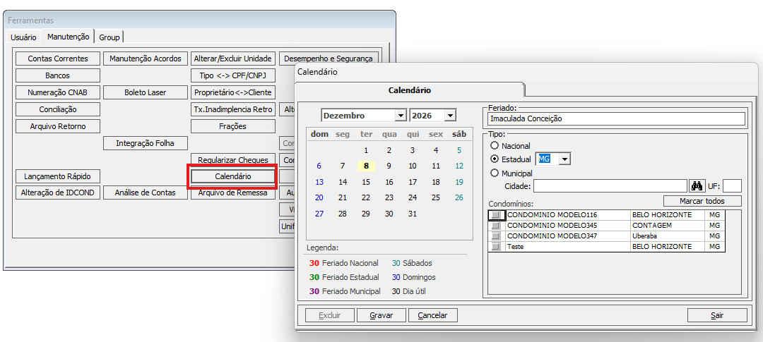 Não se considera feriados cadastrados manualmente na tela de Feriados do Condomínio21, bem como não são considerados feriados municipais.